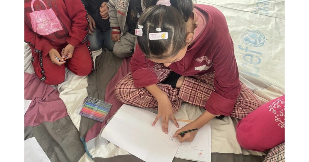 When a temporary learning space was established at the Saned site, Masa regained a small semblance of the childhood she once knew. She now attends learning sessions in a safe environment where she’s rebuilding her lost skills in Arabic and mathematics, making new friends, learning calming and coping techniques, and rediscovering joy through play and art.