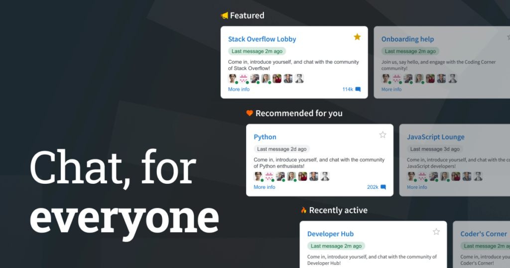 Chat introduces a new level of ease and accessibility for both new and experienced users on Stack Overflow. As Stack Overflow continues to grow into the internet’s most vital resource for technology, we recognize the critical need to enable real-time communication and connection among community members on topics essential to technologists’ success. Explore the chat rooms landing page today to find your community and begin chatting.