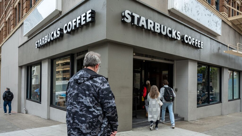Customers enter a Starbucks coffee shop in San Francisco, California, US, on Tuesday, Jan. 27, 2026.